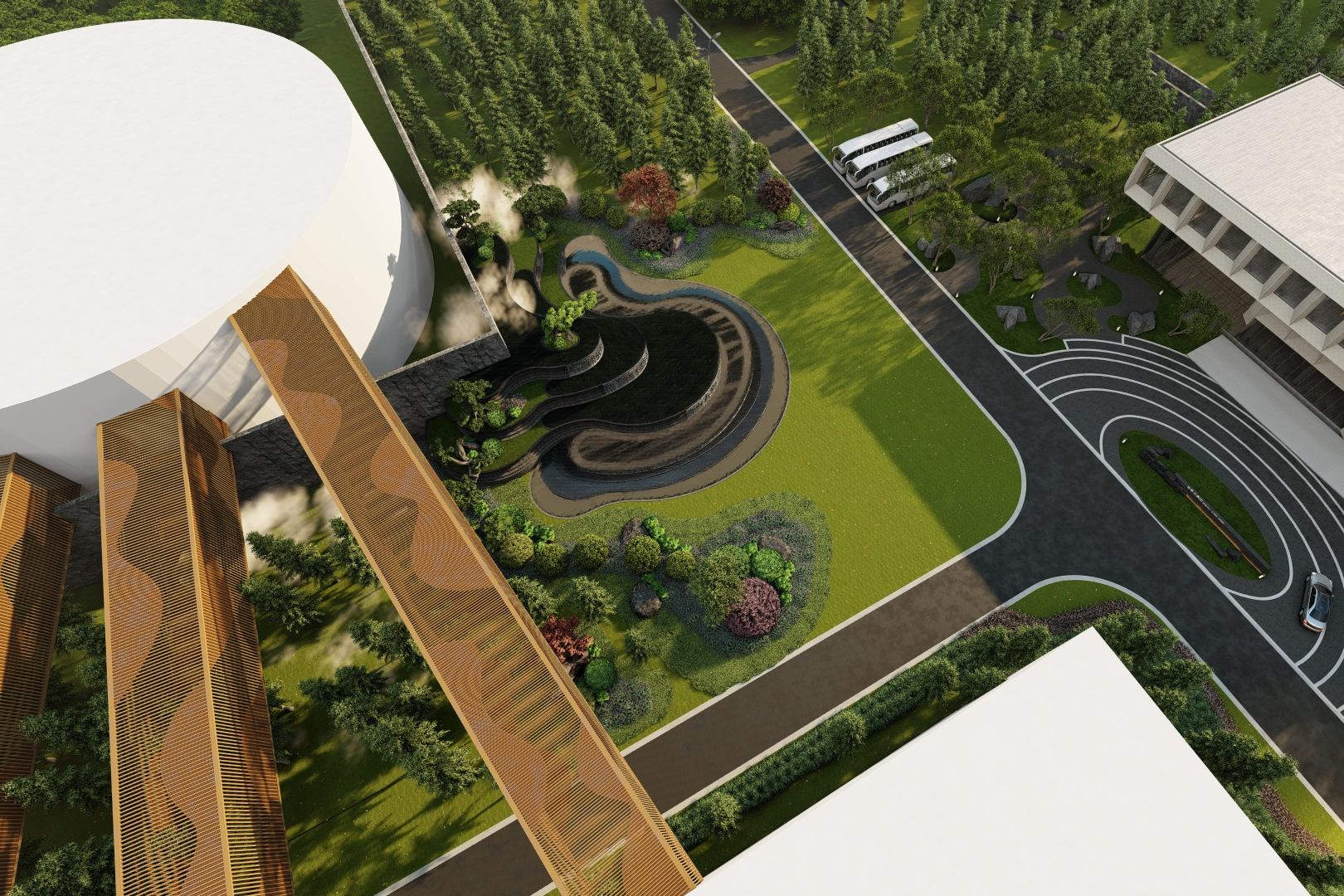 more景觀設計提取酒杯的形態(tài)設計成獨具特色的亭子,提供休息、靜讀的場所。在亭子上安裝地...